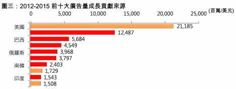 美国仍然是全球广告市场最大的贡献者。2012-2015年间全球新增广告量预估达760亿美元,单单美国地区就超过200亿美元,占了将近三成(图三)。另外值得注意的是前十大广告市场中有七个来自于新兴市场,占新增广告量的45%以上,显示新兴市场正以惊人的速度赶上发展中国家。