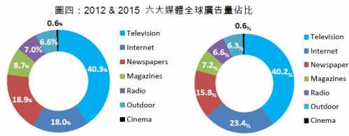 至于平面媒体的报纸与电视,在进一步进行转型前,广告量占比仍然持续衰退,到了2015年平面媒体广告量可能会持续萎缩(图四)。