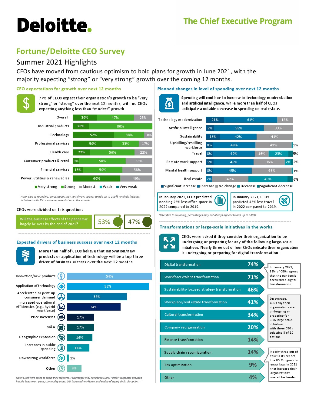首席执行官们对增长的预期与过去一致。如2021年1月的调查发现,10位CEO中有7位表示他们和员工的收入从未下降、已经恢复或将在2021年6月恢复到危机前的水平。