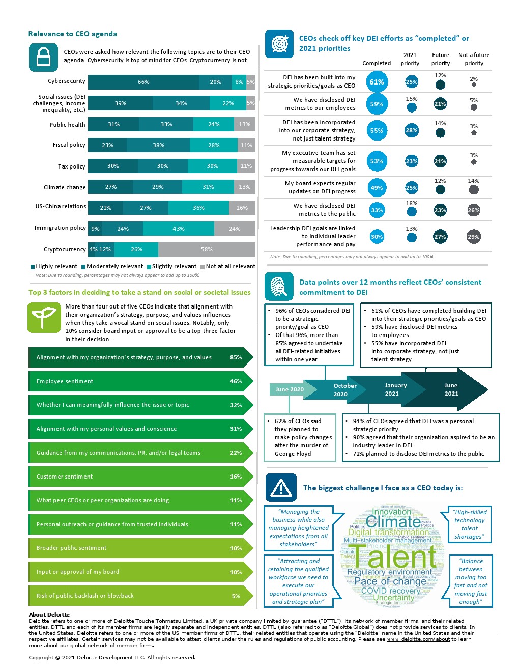 2021年1月,首席执行官对DEI的承诺仍然很强烈。当时,94%的CEO同意DEI是个人战略重点,90%的CEO同意他们的企业渴望成为DEI的行业领导者;72%的CEO计划向公众披露DEI指标。