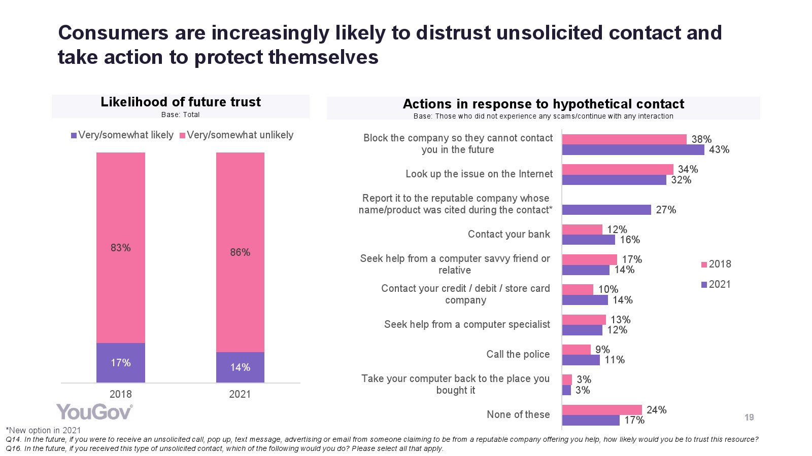 - 消费者对欺诈风险更加警惕:消费者对主动联系越来越怀疑,79%的消费者认为信誉良好的公司不太可能以这种方式联系他们(自2018年以来增加了5个百分点),86%的消费者不这种联系方式(+3%)。