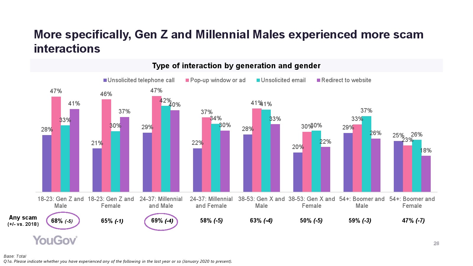 - 年轻消费者和男性仍然面临最大风险:与2018年一样,Z世代、千禧一代和男性遭受的打击最大,最有可能被骗。这可能是因为年轻一代“在线”时间更长,从事更高风险的活动。各个年龄段的人对互联网的信心都有所下降。