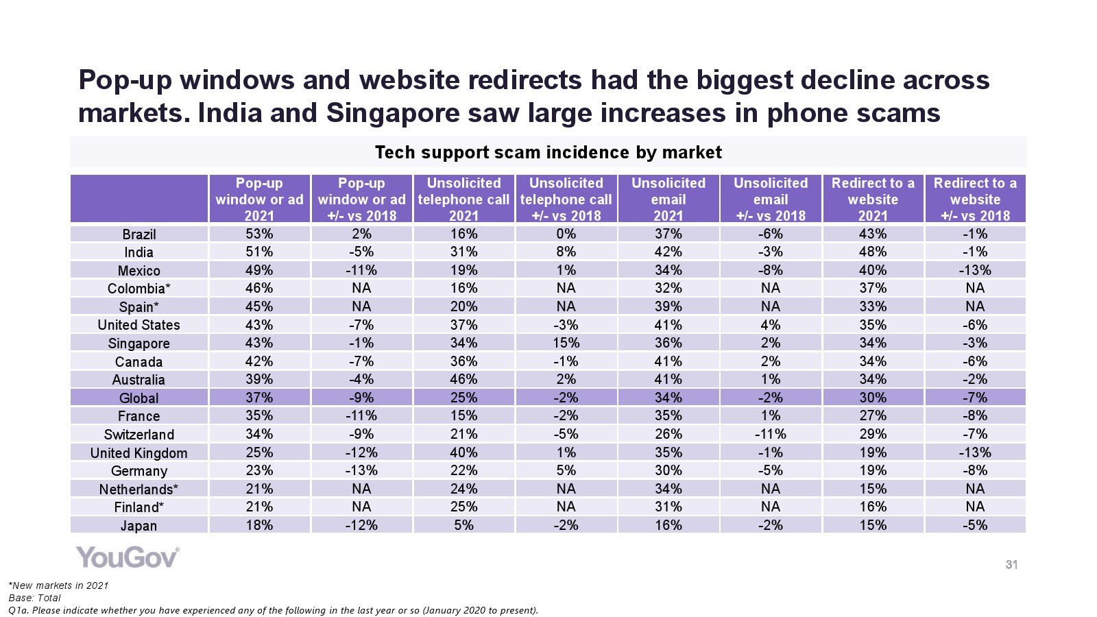 - 延续 2018 年的趋势,受骗的消费者越来越少。在全球范围内,所报告的欺诈数量下降了5个百分点,降至59%,主要是涉及弹出式广告或窗口的欺诈(2018:37% VS. 2021:45%)和网站重定向(30%VS.37%)的减少。