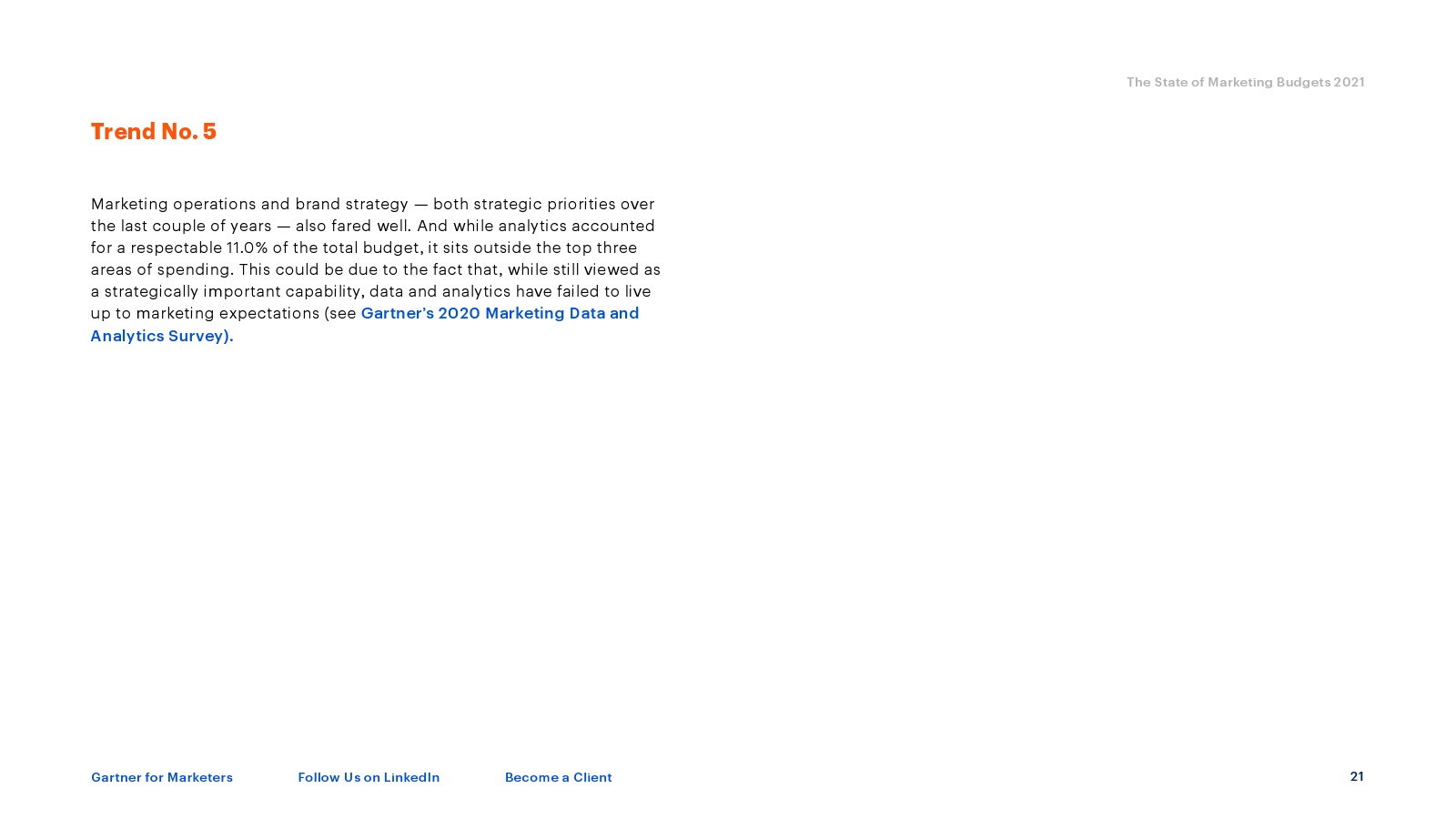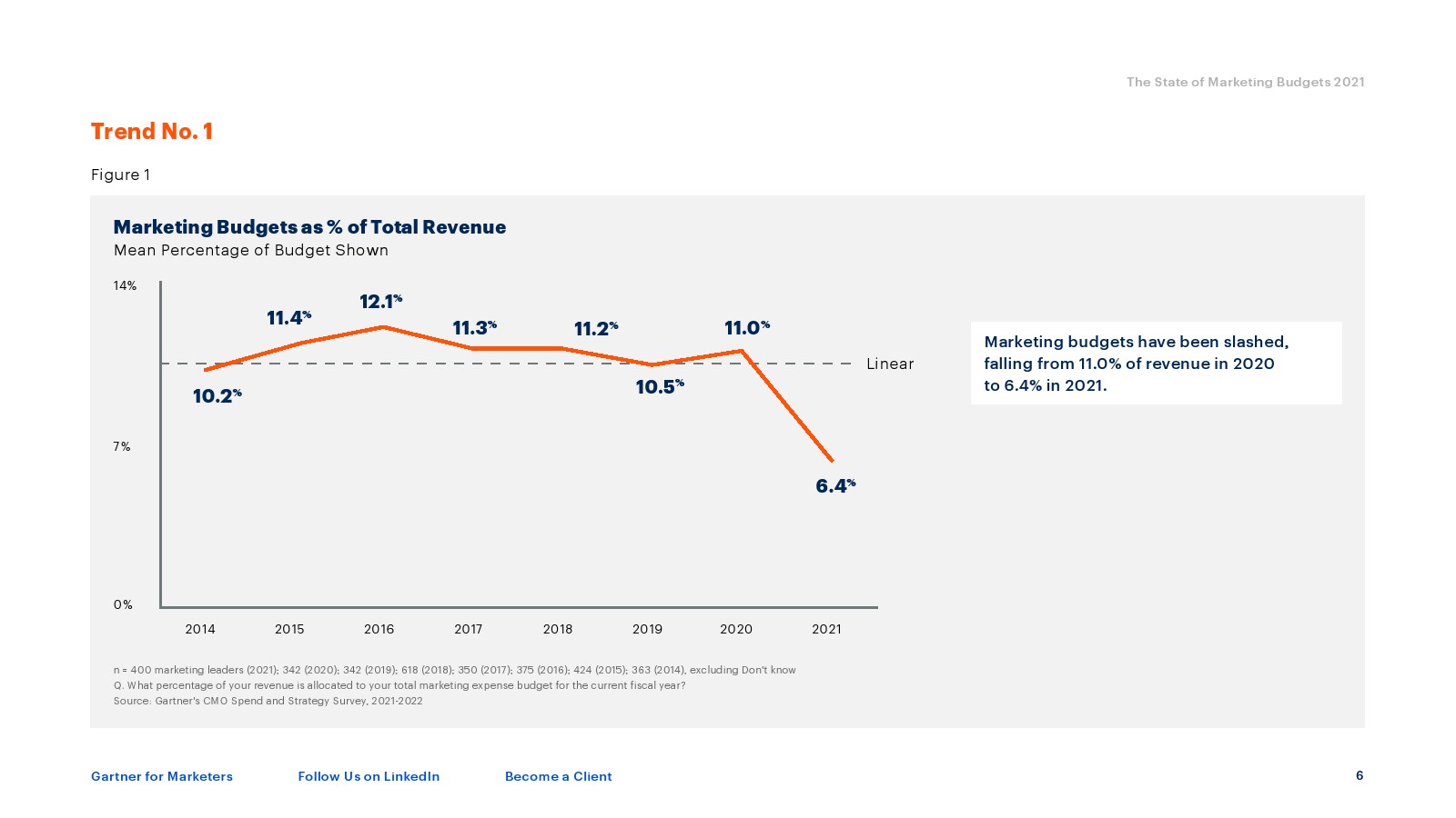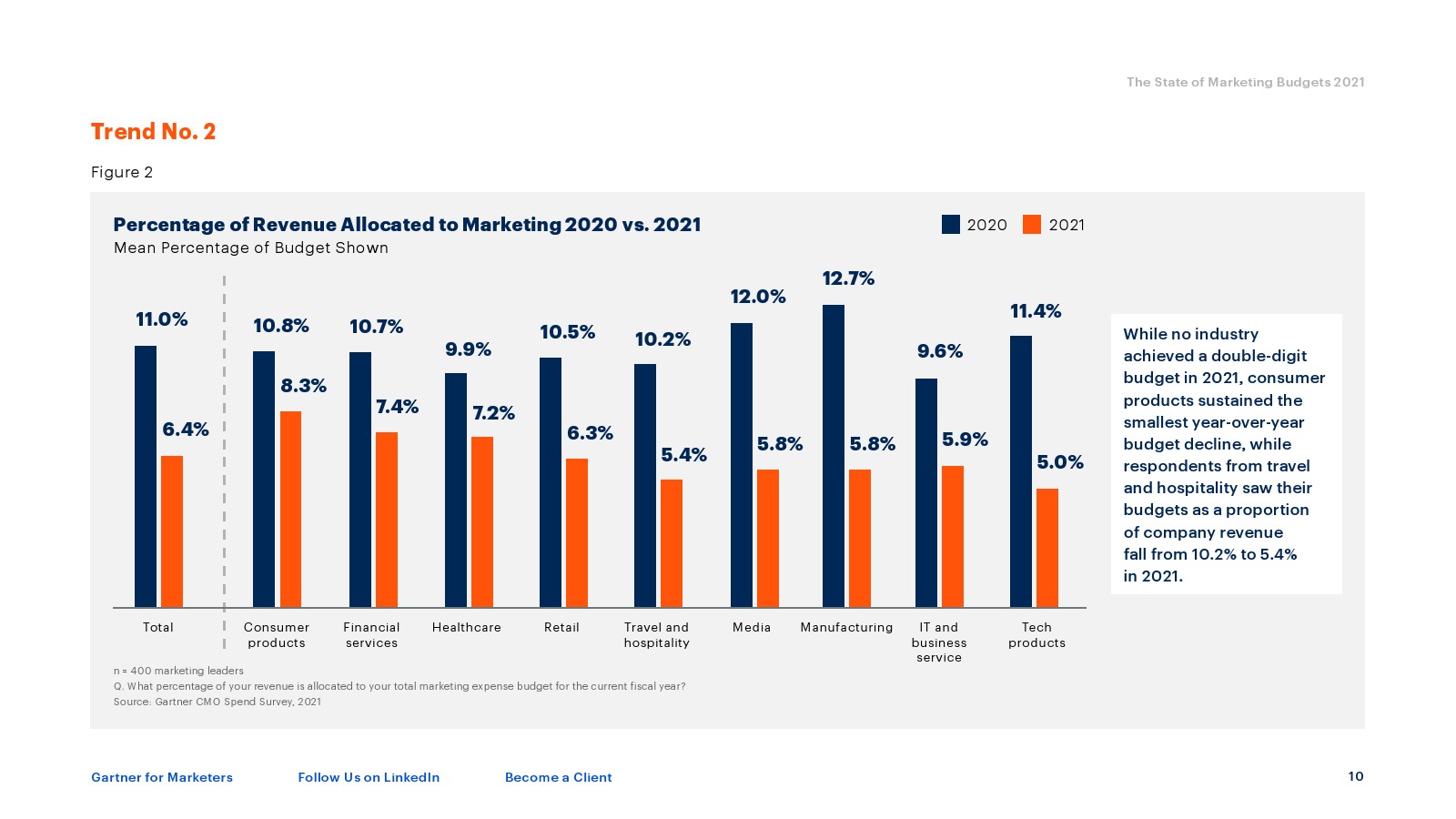 今年的快照显示,营销预算占公司收入的份额从2020年的平均11%下降到2021年的6.4%,下降了4.6个百分点。