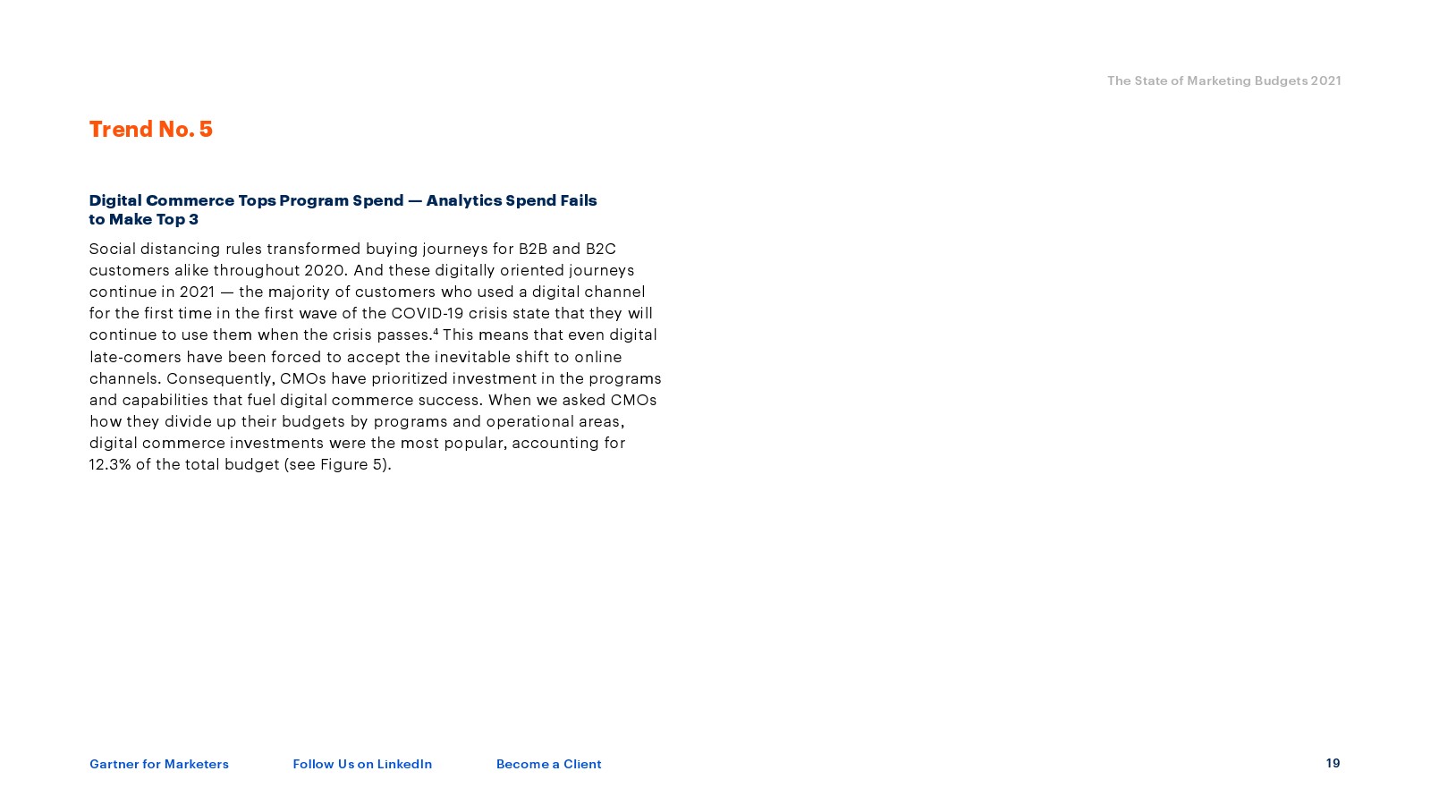 社交距离在整个2020年改变了B2B和B2C客户的购买旅程。这些以数字为导向的旅程在2021年继续发展,大多数在第一波新冠危机中首次使用数字渠道的客户表示,危机过去后将继续使用。这意味着即使是数字后来者也在接受不可避免的在线渠道转变。因此,CMO优先投资推动数字商务成功的技能,占总预算的12.3%。