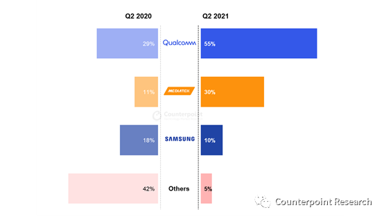 全球智能手机 5G 基带市场份额,Q2 2020 vs Q2 2021