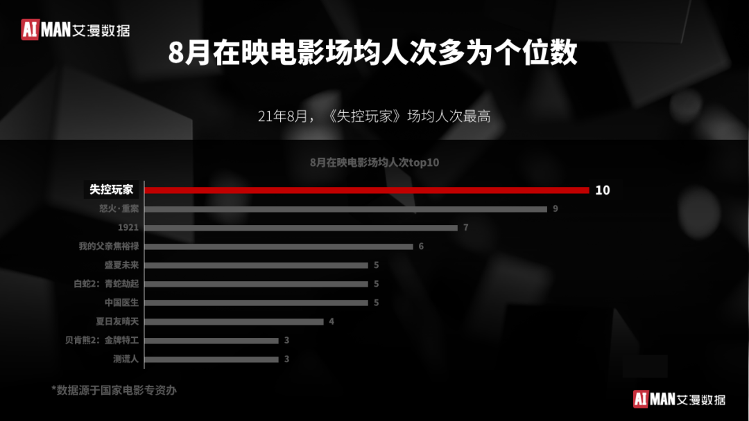 8月票房减少的原因,除了爆款的缺席之外,疫情的反扑也是重要影响因素。8月,全国多地影院因疫情影响暂停营业,因此8月总场次明显少于平均水平。同时,市场也缺乏高场均人次影片,8月场均人次最高的影片是《失控玩家》。