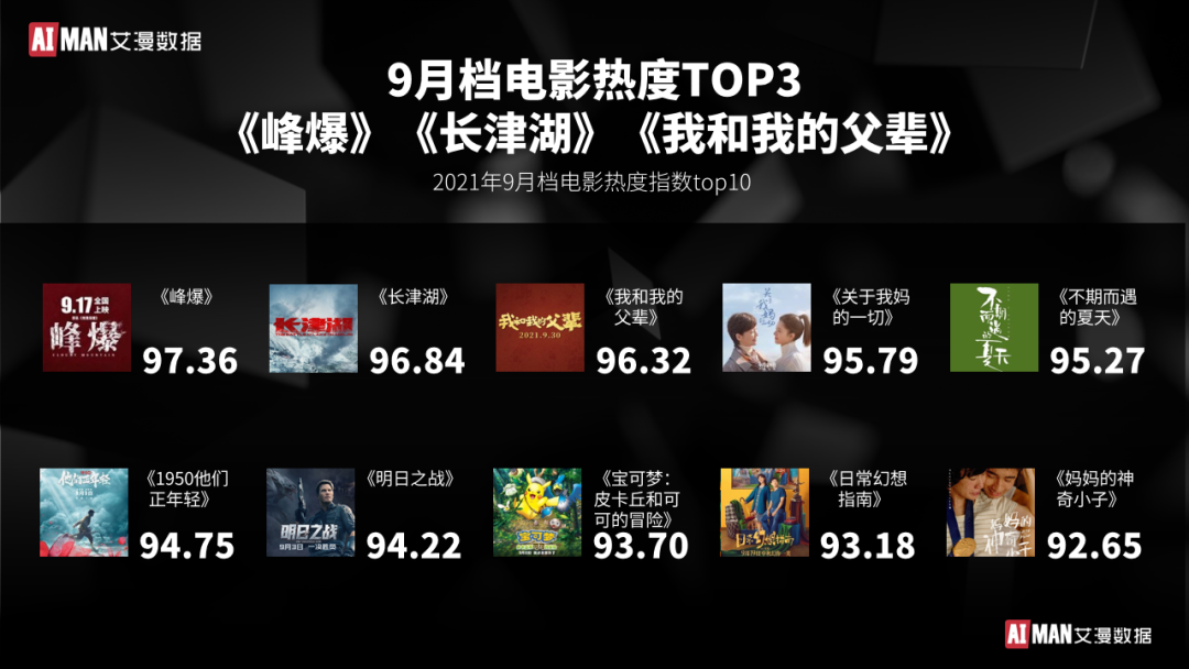 8月已经过去,坐拥“中秋档”和“国庆档”前站的9月电影市场值得展望,目前热度较高的影片有《峰爆》、《长津湖》、《我和我的父辈》。希望中秋档的前哨吹响,国庆档接力爆发,让电影市场真正的精神抖擞一把。