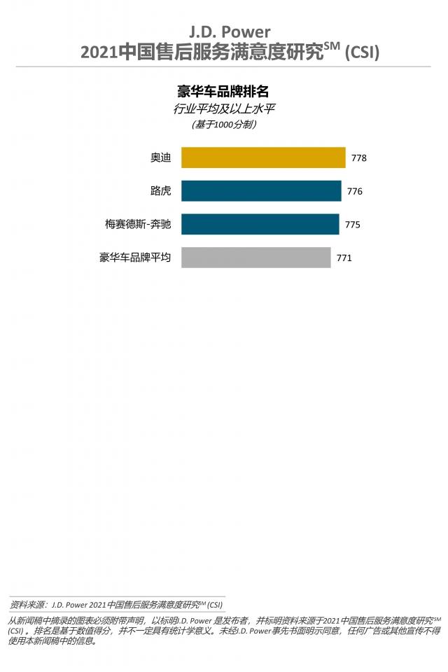 奥迪以778分位居豪华车品牌售后服务满意度榜首,路虎以776分排名第二,梅赛德斯–奔驰(775分)排名第三。