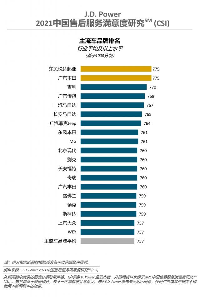 东风悦达起亚和广汽本田以775分并列主流车品牌第一。