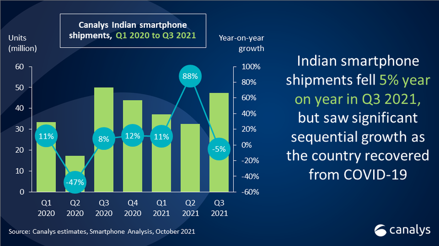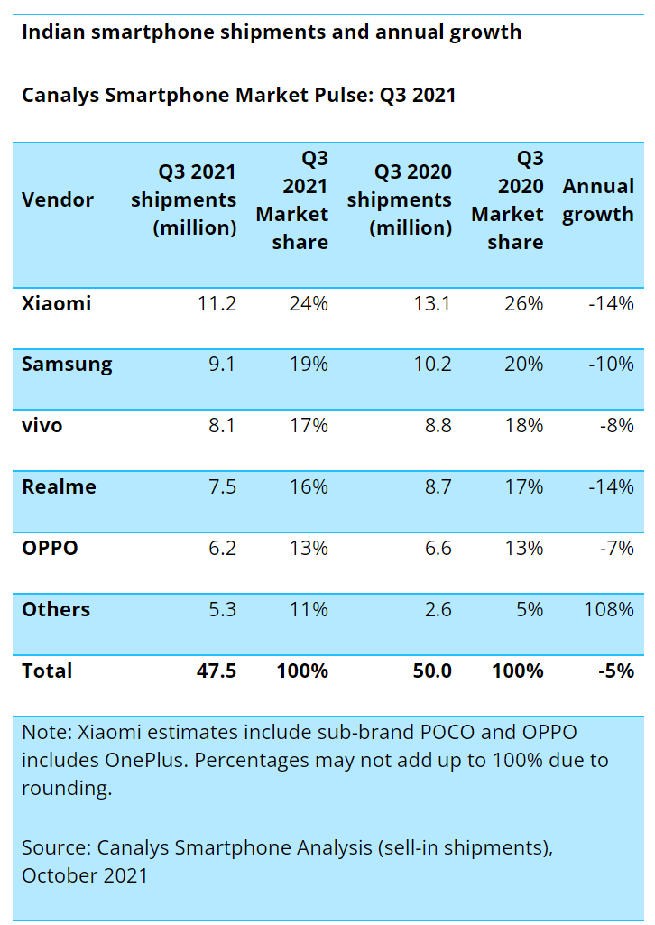 Canalys研究分析师Jash Shah表示:“印度市场份额争夺战进一步加剧。智能手机厂商正在使用一系列策略,从扩大产品组合到扩大渠道覆盖率,以增加出货量和价值。例如,小米使用其Mi 11系列来提高其在高端细分市场的份额,尽管总体份额略有下降。苹果是小米高端市场的主要竞争对手,在9月份推出iPhone 13之前,它利用促销活动为 iPhone 12 的销售注入动力。但Realme采取了不同的策略,专注于负担得起的5G,其70%的出货量是在线的。Realme 8 5G出货量约为100万台。作为挑战者品牌,竞争不太可能在短期内停止,例如Transsion试图扩大规模,扰乱印度现有企业。”