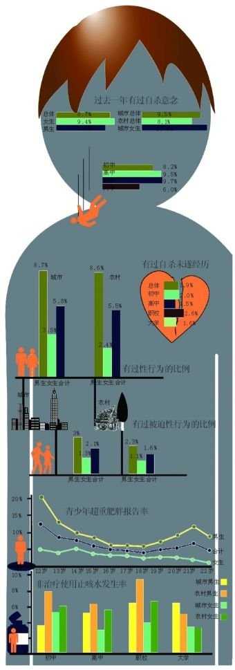 100个学生中有12个左右在过去一年发生抑郁(连续2周或更长因伤心绝望而停止平时活动),并随着学段的升高发生率呈上升趋势,来自城市的大学生抑郁率高达14.7%。