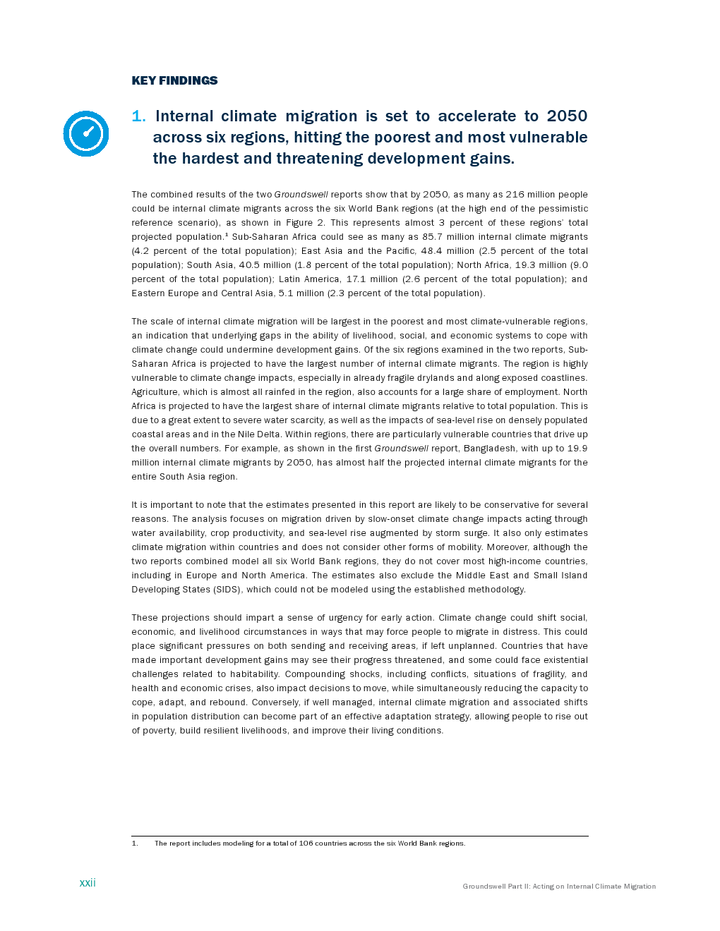 研究结果表明,到2050年全球六个地区可能有多达2.16亿人成为内部气候移民。这几乎占这些地区总人口的3%。撒哈拉以南非洲地区可能有多达8570万气候移民(占总人口的4.2%);东亚和太平洋地区有4840万人(占总人口的2.5%);南亚有4050万人(占总人口的1.8%);北非1930万人(占总人口的9.0%);拉丁美洲为1710万人(占总人口的2.6%);东欧和中亚为510万人(占总人口的2.3%)。
