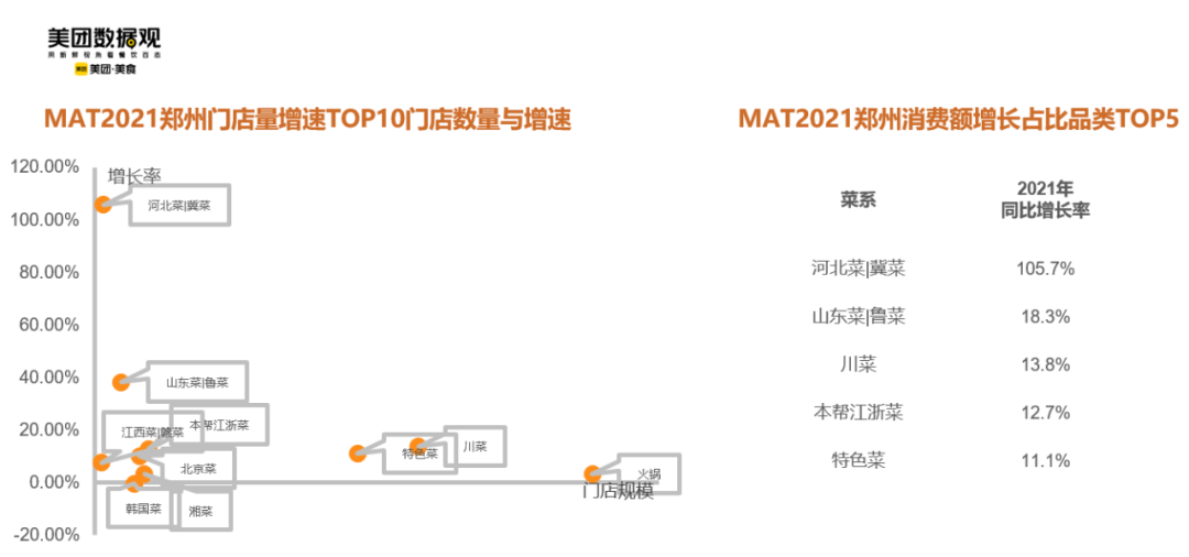 美团数据观显示,MAT2021郑州门店增速TOP10中地方菜占8席,消费者的口味逐渐开始多元化。