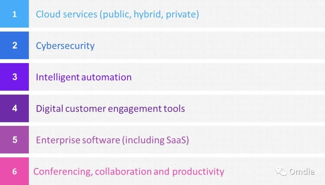 在企业服务和新兴技术方面,Omdia预计将会出现以下情况: