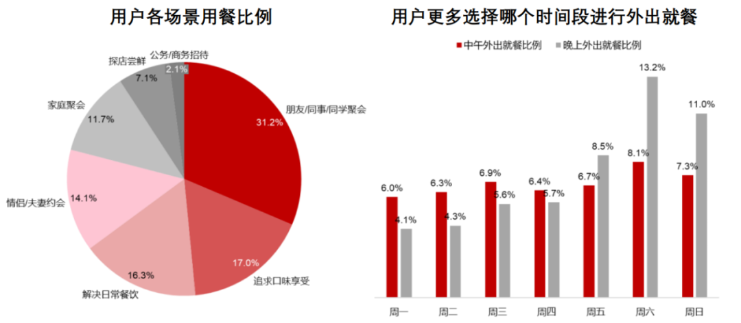 从用户的消费场景看,聚餐是最主要的到店就餐场景。根据美团点评统计的用户各场景用餐比例,朋友/同事/同学聚会、追求口味享受和解决日常餐饮是日常用餐最主要的三个场景,分别占31.2%17.0%16.3%,周中中午、周末晚上在外用餐比例更高。