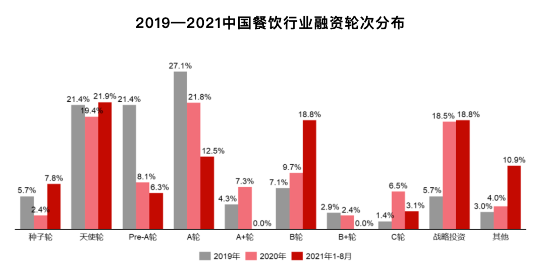 从融资轮次分布也可以验证我们的上述观点,可以看到,与2019年相比,餐饮行业投融资在2020年和2021年最主要的特征是B轮、战略投资以及其他后期投资占比有明显提升;Pre-A轮、A轮等早期投资占比有所下降。