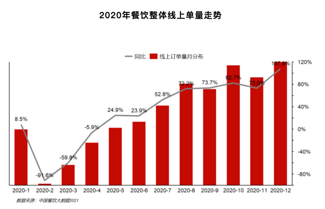 根据《中国餐饮大数据2021》的数据,受到疫情的影响,部分时段内外卖行业负增长,但消费者在疫情得到控制后更多的通过外卖进行餐饮消费:2020年,餐饮线上订单整体保持高速增长,除疫情影响特别严重的2-4月,其他各月同比均实现正增长,且订单量同比增长在2020年第四季度基本维持在70%以上,在12月甚至实现了107.9%的翻倍增长。预计在当前疫情逐渐常态化的环境下,外卖行业可能仍将持续强劲发展。外卖的强劲增长也给了餐饮门店一个扩展自身收入、触达更多消费者的机会:根据实地调研,部分传统餐饮门店的外卖比例已经能够达到50%甚至更高。