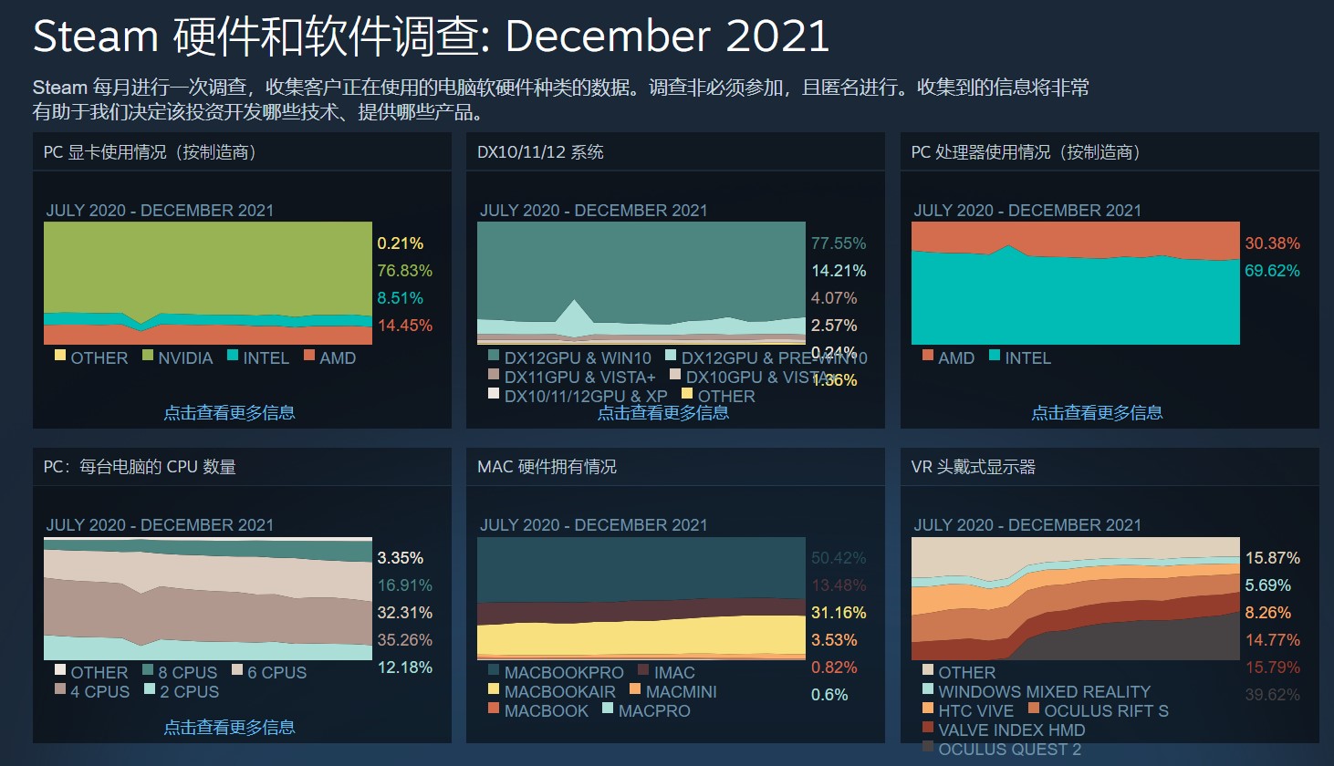 Steam近日发布了2021年12月份“硬件和软件调查”报告,该调查匿名收集玩家的电脑软硬件种类数据,对于PC玩家很有参考意义。12月份各项数据与之前相比,变化最大的是Oculus Quest 2 VR设备占有率增长了3.30%。