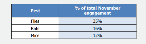 苍蝇和老鼠是11月总体参与度最高的害虫话题,占11月份害虫相关话题参与度的一半以上。