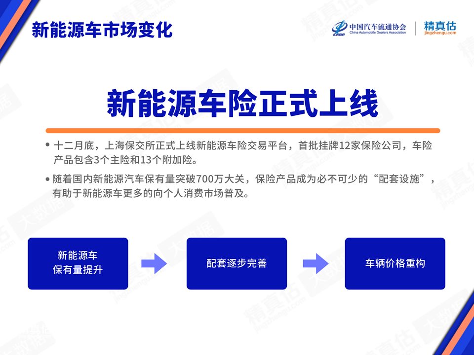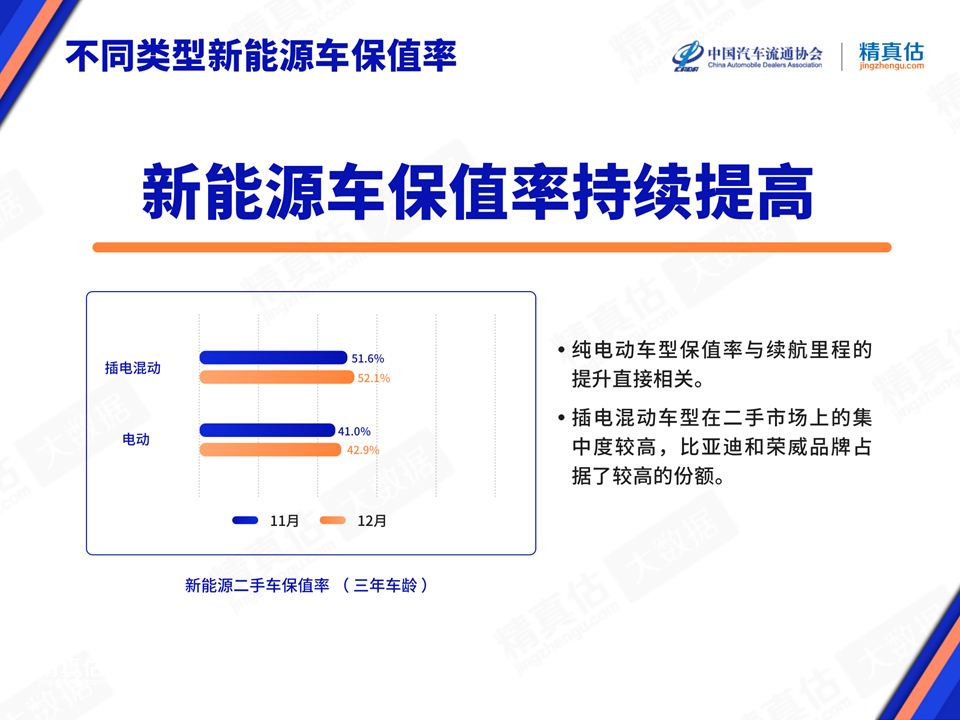 中国汽车流通协会&精真估:2021年12月中国汽车保值率报告 2022年1月,中国汽车流通协会和精真估联合发布了《2021年12月中国汽车保值率研究报告》。通过保值率研究旨在反应该品牌的产品力、认知度、美誉度等综合实力,对未来开展回购、置换、租赁、金融、新车定价参考等相关业务提供重要数据参考,从而降低业务风险,提升经营效率。 政策方向——节能减排技术受到鼓励 12月,工信部发布了对“双积分”核算方法的微调。通过先进技术手段实现低油耗的传统燃油车,政策方向以“稳”为主,对于制动能量回收系统、高效空调这两项切实降低油耗的技术,给予一定的积分减免。在践行碳达峰、碳中和的同时,先进技术的采用一直以来都受到鼓励。相似的减免措施在2020年度积分核算当中已经采用。 热点事件——便民利企新措施 本次制定和修订的《机动车登记规定》《机动车驾驶证申领和使用规定》《道路交通安全违法行为记分管理办法》,是公安交管部门主动适应经济社会发展新形势,“为群众办实事”的重要成果。二手车异地交易登记,从2021年9月起已经在部分地区开始推广。本次修订《机动车登记规定》将之前的改革措施落实到法规层面,推进了制度化、法制化。 线上车源量变化——车源量反弹乏力 随着十二月新车置换的恢复,二手车源也出现反弹增长。十二月环比增长,符合长期以来的季节趋势,但同去年相比,2021年十二月单月的车源量仍有明显的差距,反弹力度不足,车商经营风险仍然偏高。连锁化、品牌化的二手车商更加能够抵御市场变化的风险,这已经成为二手车行业发展的趋势。 各级别保值率——SUV保值率提高 长期以来,二手车交易量当中轿车的份额远高于SUV,但从保值率来看,SUV更具优势,月度数据也出现环比增长,尤其是中大型SUV。轿车当中,虽然进一步细分可以发现中大型轿车的保值率也比较高,但这其中豪华品牌较多,二手车价格当中品牌溢价的成分较多,主流的自主品牌和合资品牌很少涉及这一细分。另外,小型车销量萎缩的同时保值率却提高,这个现象需要车商经营当中对“量”和“价”做出取舍。 新能源车市场变化——新能源车险正式上线 保险产品应视作汽车消费当中重要的配套设施。新能源汽车此前并没有完善的保险产品,本次新的保险产品上线,标志着新能源汽车消费的“配套设施”更加完善。保险是汽车使用成本当中的重要组成部分。在首次购车时,保险费用也已经与新车价格相互绑定,成为影响消费者购车决策的重要因素。在2022年元旦之后,新能源汽车价格又将开始新一轮的重构,这个重构当中既包括补贴退坡的影响、保险费用的影响、也可能包括电池租用的影响等。目前有的厂商已经开展了一系列“保价”措施。 不同类型新能源车保值率——新能源车保值率持续提高 在2021年底,纯电动车新车的续航里程已经能够达到一千公里。二手车普遍续航里程也达到了三百公里的及格水平,能够满足基本的通勤需求。续航里程这一指标直接影响二手车价格。插电混动车型在二手市场中以自主品牌为主,三年车龄的车源当中,比亚迪和荣威品牌占据的份额合计超过总量的一半。这两个品牌对细分市场保值率的影响很大。 更多阅读:中国汽车流通协会:2022年4月中国汽车保值率报告中国汽车流通协会&精真估:2021年5月中国汽车保值率研究报告 国产车保值率三年折价一半中国汽车流通协会&精真估:2023年5月中国汽车保值率研究中国汽车流通协会&精真估:2022年8月中国汽车保值率报告中国汽车流通协会&精真估:2022年3月中国汽车保值率中国汽车流通协会&精真估:2022年2月中国汽车保值率研究中国汽车流通协会&精真估:2021年10月中国汽车保值率报告中国汽车流通协会&精真估:2020年8月中国汽车保值率中国汽车流通协会:2023年1月中国汽车保值率报告中国汽车流通协会:2022年12月中国汽车保值率中国汽车流通协会:2022年11月中国汽车保值率报告中国汽车流通协会:2022年6月份中国汽车保值率中国汽车流通协会:2022年7月中国汽车保值率中国汽车流通协会:2024年6月中国汽车保值率报告中国汽车流通协会:2024年6月中国汽车保值率报告