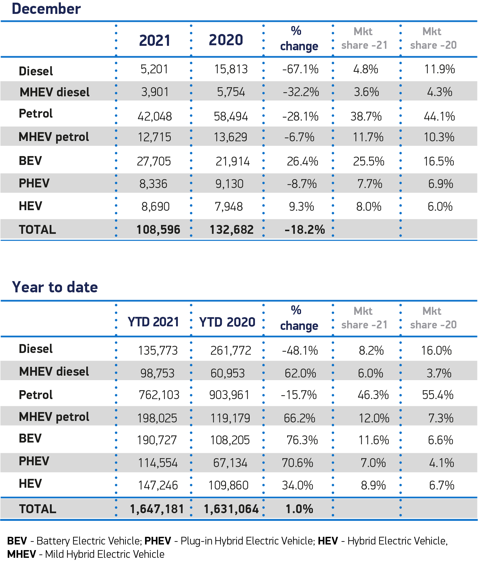 包括轻度混合动力车(MHEV)在内的汽油动力汽车仍然是最受英国人欢迎的汽车,占2021年新注册车辆的58.3%,包括MHEV在内的柴油动力汽车(占14.2%的市场份额),其次是BEV(11.6%)、HEV(8.9%)和PHEV(7.0%)。