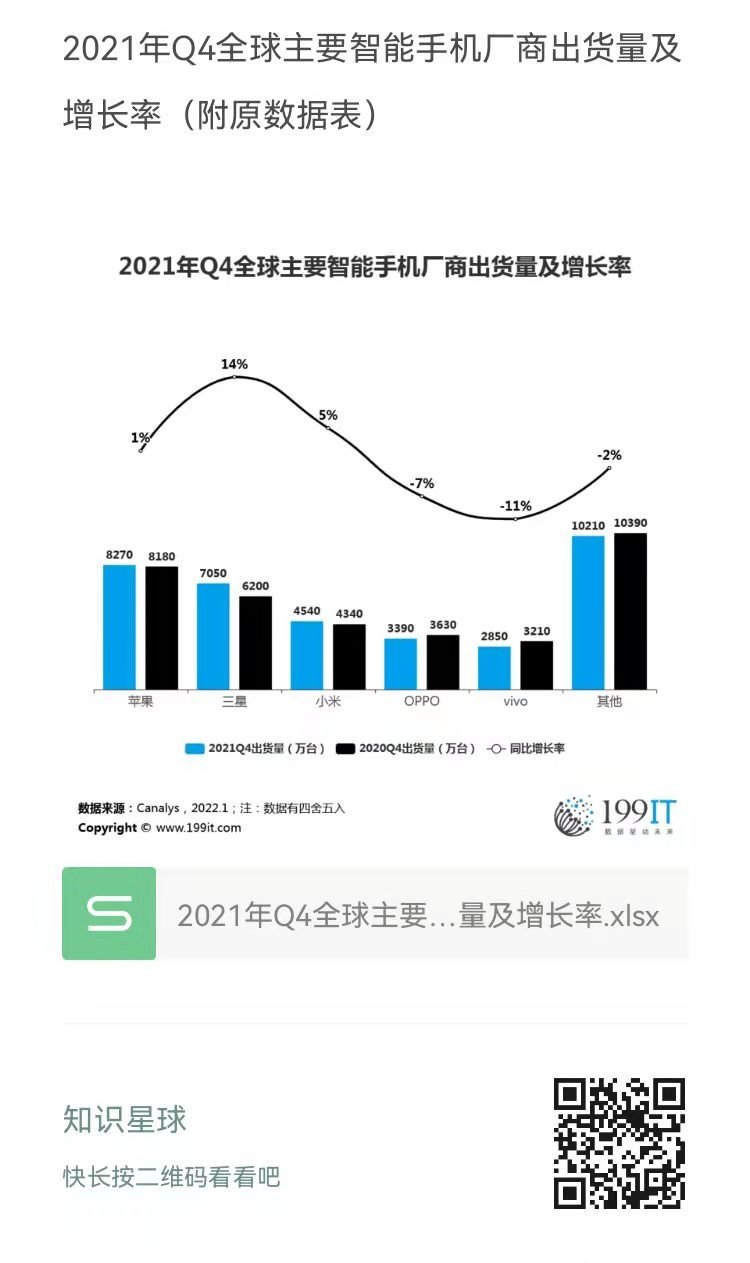 2021年Q4全球主要智能手机厂商出货量及增长率(附原数据表) ​​​​