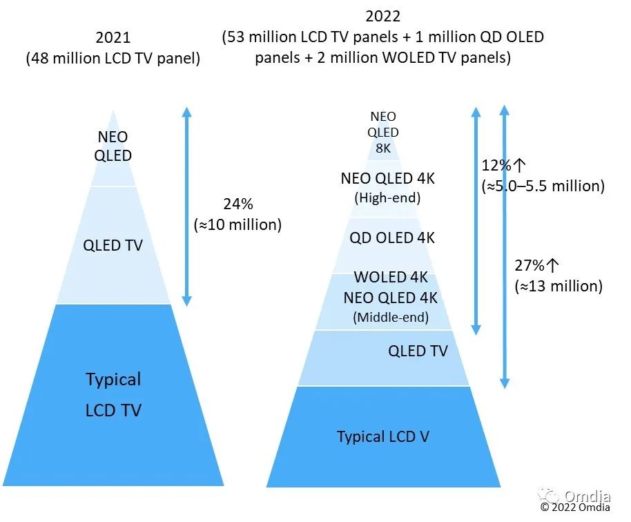 2022 年,三星 VD 计划将其高端电视的销售占比提高到 27%,也就是 1300 万台,总体销售目标为 4800 万台。Neo QLED 和 OLED 将共同贡献 12%,约为 500 万至 550 万台。