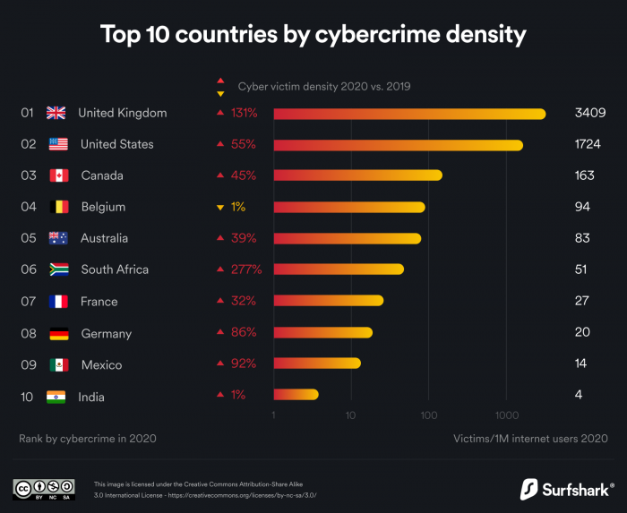 即使低至每百万仅 4 位受害者(增长率 1%),印度这个新兴市场还是排到了榜单的第 10 名,增长率方面。