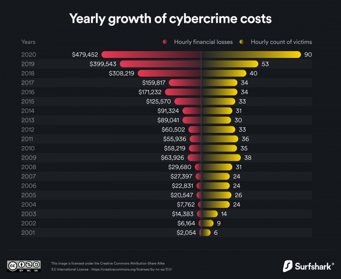 自 2001 年以来,网络犯罪受害者人数增加了 15 倍、经济损失达到了 200 多倍 —— 从每小时 2000 美元、扩大到了 48 万美元。
