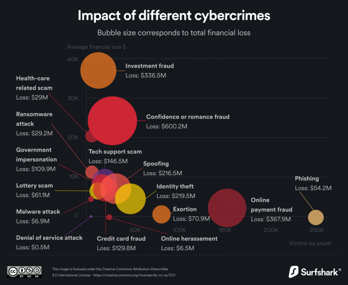 不过骗取信任和情感欺诈的总体经济影响最大,人们因此在 2020 年损失超 6 亿美元,乃至 DDoS 攻击的影响力都被衬托得低了不少(约 2000 受害者上报 / 人均损失 254 美元)。