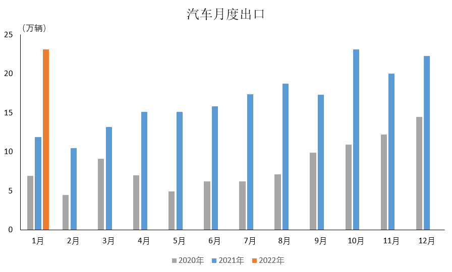 中国汽车工业协会:2022年1月汽车生产企业出口情况简析 据中国汽车工业协会统计分析,2022年1月,汽车出口增长势头迅猛。 2022年1月,汽车企业出口23.1万辆,环比增长3.8%,同比增长87.7%。其中,新能源汽车出口增长贡献度为43.7%。 2022年1月,乘用车出口18.5万辆,环比下降1.1%,同比增长94.5%。 2022年1月,商用车出口4.6万辆,环比增长29.5%,同比增长64.8%。 更多阅读:中国汽车工业协会:2021年12月汽车生产企业出口情况简析中国汽车工业协会:2021年11月汽车生产企业出口情况简析中国汽车工业协会:2021年10月汽车生产企业出口情况简析中国汽车工业协会:2023年1-2月我国汽车商品出口金额前十国情况简析中国汽车工业协会:2022年3月前十位轿车品牌销量排名中国汽车工业协会:2021年5月汽车工业运行情况简述中国汽车工业协会:2021年9月汽车生产企业出口17.3万辆 同比增长74.0%中国汽车工业协会:2025年6月汽车工业产销报告中国汽车工业协会:2025年4月中国汽车工业经济运行报告中国汽车工业协会&和君:2024中国汽车后市场年度发展报告(乘用车)中国汽车工业协会:中国汽车基础软件发展报告5.0中国汽车工业协会:2024年6月中国品牌乘用车销售情况简析中国汽车工业协会:2024年1-6月前十位SUV生产企业销售情况简析中国汽车工业协会:2024年3月中国汽车工业经济运行情况中国汽车工业协会:2023年8月汽车工业产销情况简析