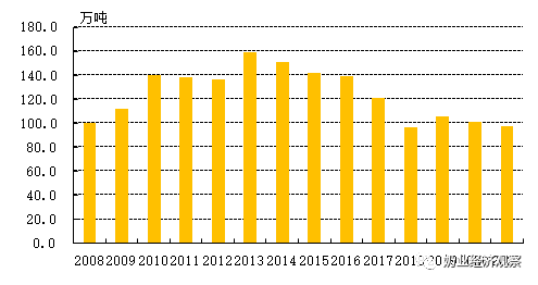 注:规模以上乳品企业(年销售额 2000 万元及以上)的产量统计,每年企业数量不一样。