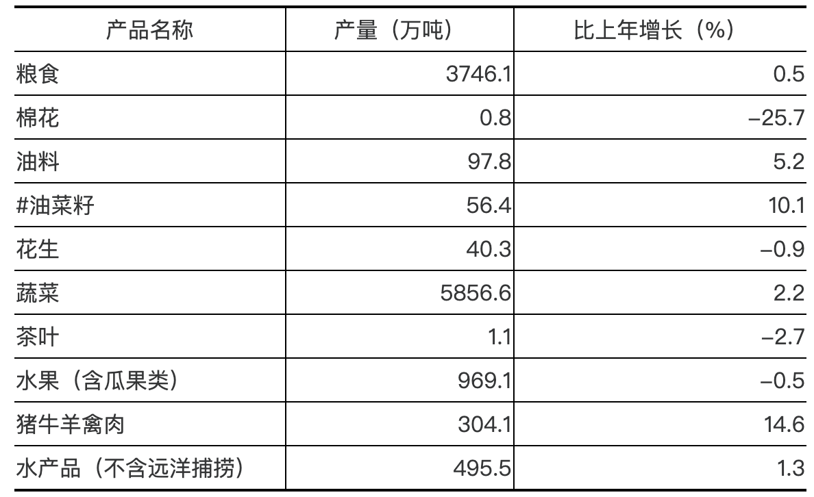 种植业结构持续优化。全年粮食播种面积542.8万公顷,比上年增加2.2万公顷;棉花种植面积0.6万公顷,减少0.3万公顷;油料种植面积29.6万公顷,增加1.8万公顷;蔬菜种植面积145.3万公顷,增加0.9万公顷。农业综合生产能力持续增强,全年粮食总产量再创新高,达3746.1万吨,比上年增产17.0万吨,增长0.5%。其中,夏粮1380.7万吨,增长0.5%;秋粮2365.4万吨,增长0.4%。粮食亩产460.1公斤,比上年增加0.2公斤,增长0.1%。