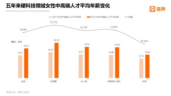 全国硬科技以及四大城市群的硬科技女性中高端人才的平均年薪也处于上升态势,2021 年全国硬科技女性中高端人才的平均年薪为 18.57 万元。京津冀、长三角、大湾区硬科技女性中高端人才平均年薪均高于全国水平,为 22.10 万、19.52 万、19.26 万元。从硬科技领域女性人才的薪资涨幅来看,京津冀和大湾区最高,为 37.31%、33.02%。