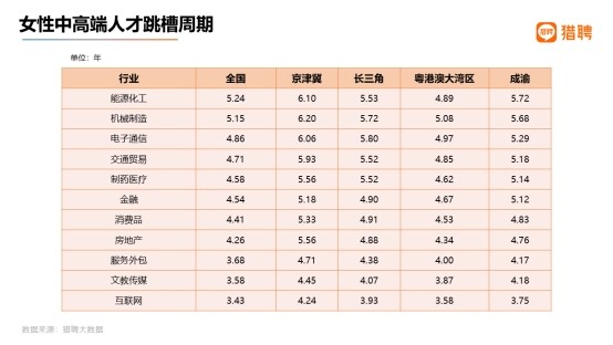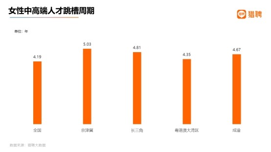 从中高端女性人才跳槽频率来看,四个城市群均高于全国水平。全国女性中高端人才的跳槽周期是 4.19 年;京津冀、长三角、大湾区、成渝分别是 5.03 年、4.81 年、4.35 年、4.67 年。相比之下,全国大湾区的女性中高端人才跳槽越频繁,而京津冀的中高端女性人才则工作状态最稳定。