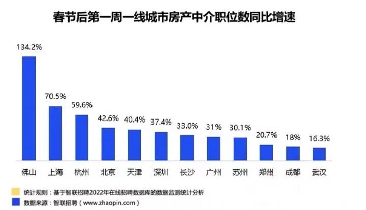 数据显示,节后开工第一周,房地产行业招聘职位数同比减少29%,降幅高于全行业的4.5%。值得关注的是,房产中介职位数同比增速达到14.2%,其中,一线城市房产中介职位数同比增速达到44.1%,高于新一线、二线、三线及以下城市。其中,佛山房产中介招聘职位数同比增长134.2%,增速位居第一。其次是上海和杭州,同比增长分别为70.5%、59.6%。