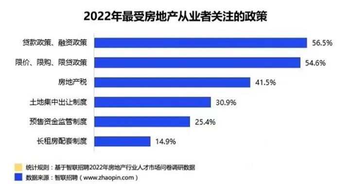 同时,调研显示,56.5%的房地产从业者关心贷款、融资政策,54.6%的从业者关心限价、限购、限贷政策,41.5%的从业者关心房地产税,而关心土地出让、资金监管、长租房配套等政策的从业者分别占30.9%、25.4%和14.9%。可见,房地产从业者更关心与企业生存发展、房屋销售等直接相关的政策,而对土地出让等政策关心较少。