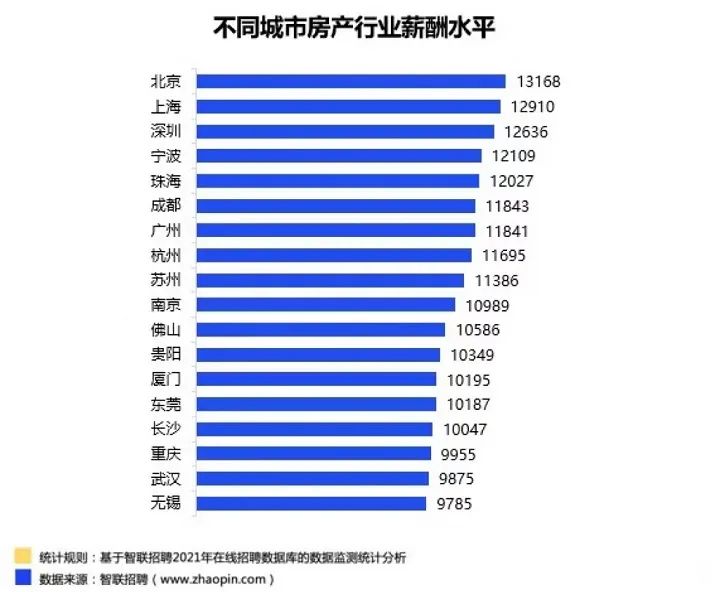 2021年第四季度,房地产行业平均招聘薪酬达10394元,高于第一至三季度水平。同时,房地产行业平均招聘薪酬,也高于全行业平均值的10111元。分城市看,一线城市薪酬优势依旧明显,北京的房地产行业平均招聘薪酬最高,达到13168元。其次是上海和深圳,分别为12910元、12636元。新一线城市宁波排名第四,平均招聘薪酬12109元,超过了一线城市广州。