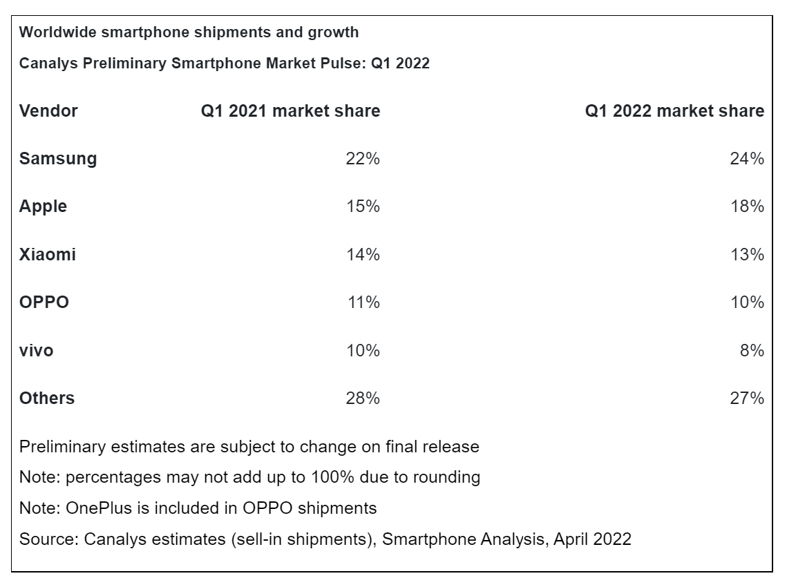 由于不利的经济状况和2022年第一季度季节性需求低迷,全球智能手机出货量同比下降11%。供应商改进其2022年产品组合,三星以24%的市场份额领先市场,高于2021年第四季度的19%。由于对其 iPhone13系列的需求不断增长,苹果公司排名第二,第一季度业绩稳健增长。由于红米Note系列的出色表现,小米保持在第三位。 OPPO(包括一加)和vivo分别以10%和8%的份额位列前五。