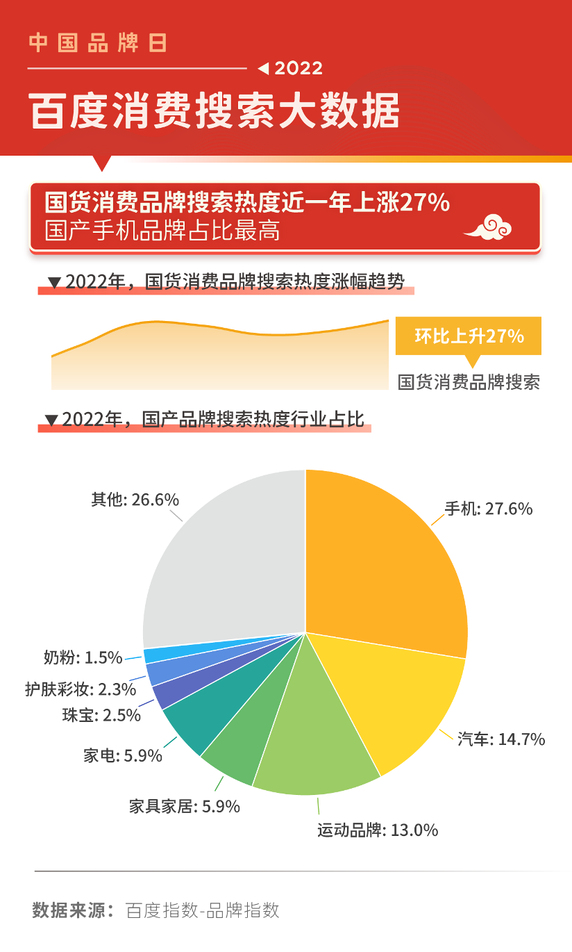 2022年 5 月 10 日,是第六个中国品牌日。百度发布《中国品牌日 ·2022 百度消费搜索大数据》(以下简称 “数据”),洞察中国品牌的全民关注。