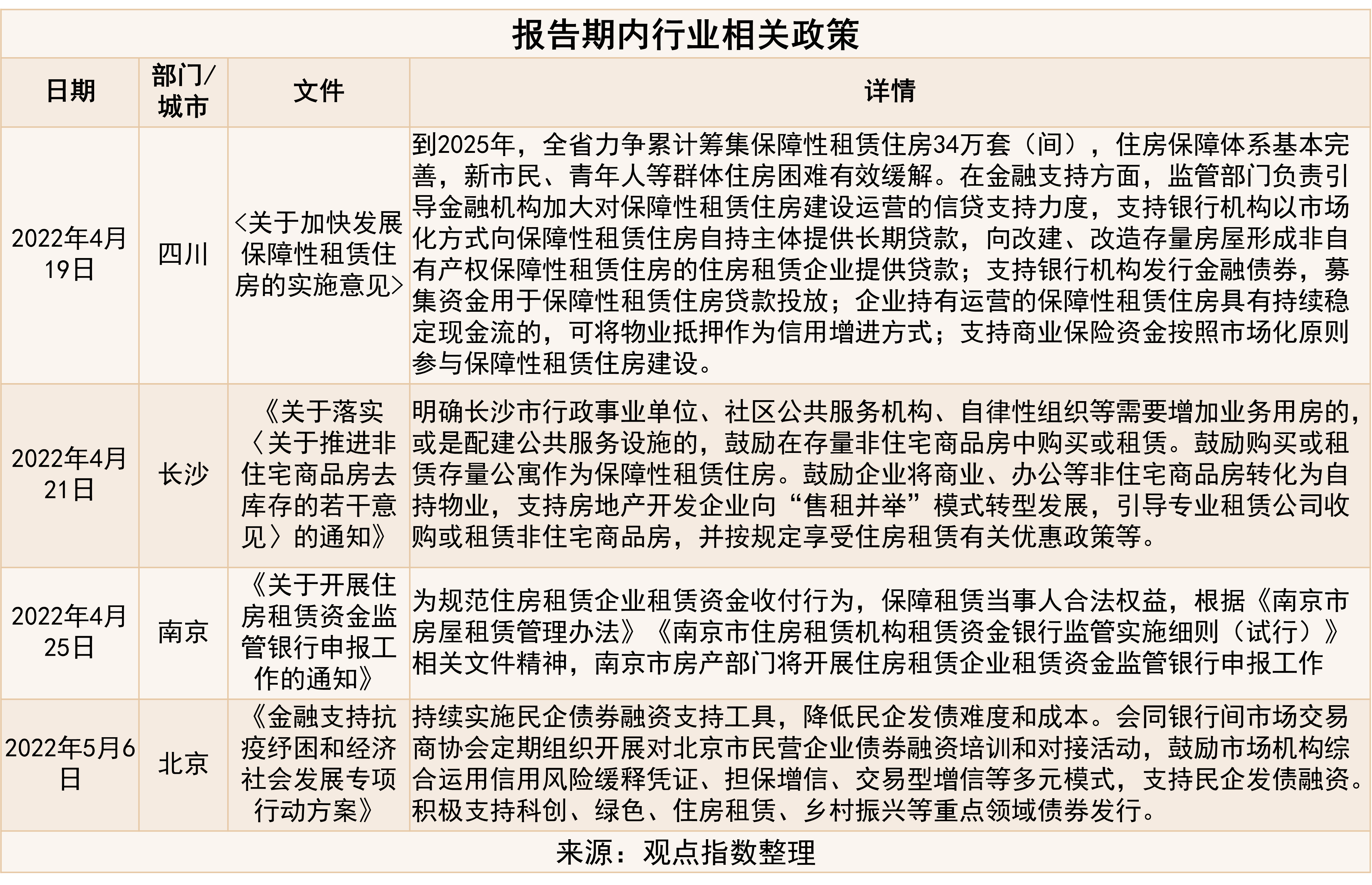 回顾报告期内行业颁布的相关政策,主要涉及租赁市场资金监管,鼓励非改租、加大租赁市场供给以及支持金融机构推动保障性租赁住房发展等。
