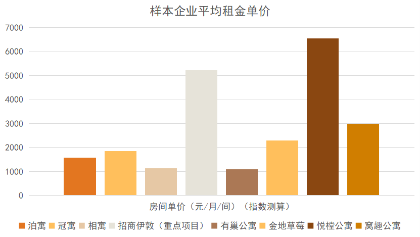 据观点指数简单测算,8 个样本企业中房企系背景的泊寓、冠寓以及有巢公寓平均租金均低于 2000 元 / 月 / 间,主要是由于三者产品多数是面向年轻群体而打造的青年公寓,其中冠寓平均租金最高,达 1859 元 / 月 / 平方米。