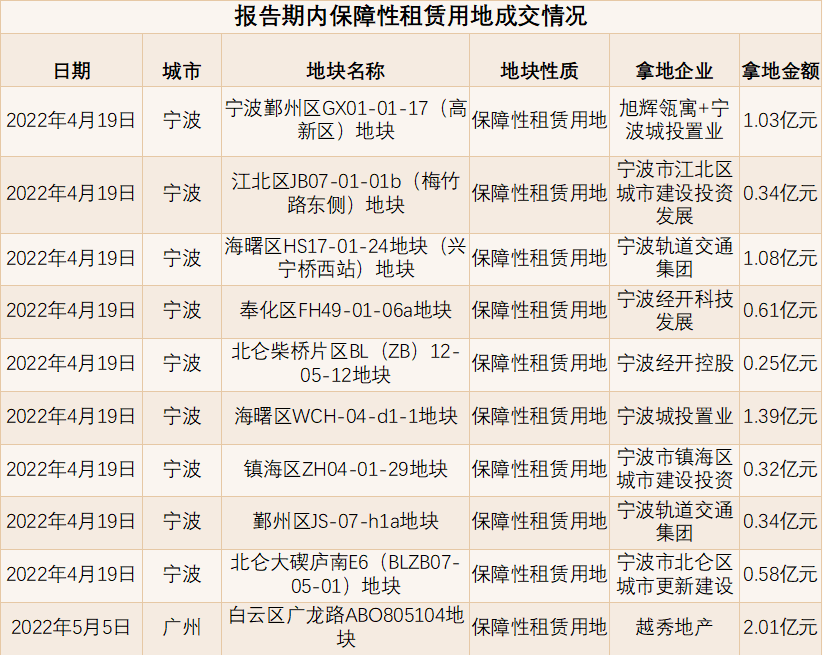 报告期内,旭辉瓴寓携手宁波城投置业以底价 1.03 亿元竞得宁波鄞州区 GX01-01-17(高新区)地块,地块性质为保障性租赁用地,是旭辉瓴寓继上海市松江区工业区科技园区新城 C01-14B-02/C01-14B-09 号地块(旭辉瓴寓与松江国资委合作拿地)、南京市建邺区河西南 G116 地块(旭辉竞得,旭辉瓴寓运营管理)联合拍得的第四幅租赁用地。