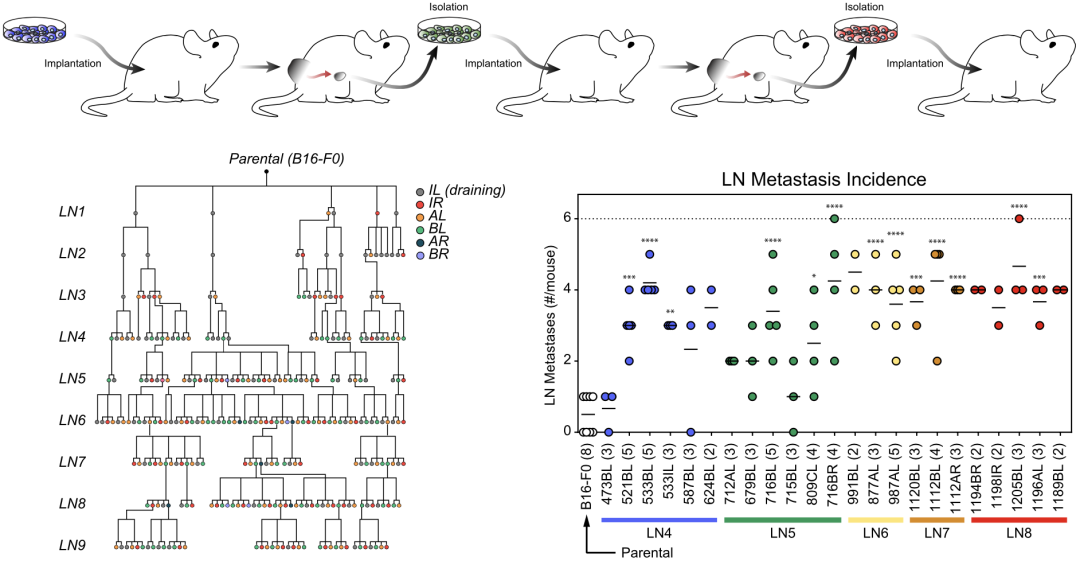 首先他们将低转移性的黑色素瘤细胞B16-F0(母系低淋巴转移株)接种于小鼠皮下,收集淋巴结中转移的肿瘤细胞,再移植到新的小鼠皮下,循环九代不断收集淋巴结定植的肿瘤细胞再移植,如此得到在非引流淋巴结中定植能力不断增强的300株细胞(高淋巴转移株)。