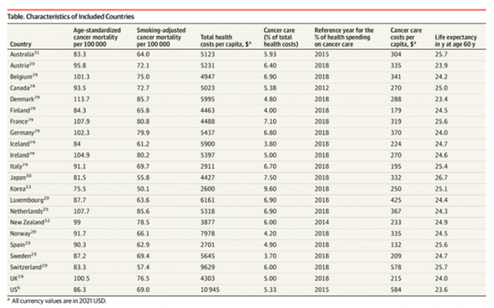 事实上,六个国家–澳大利亚、芬兰、冰岛、日本、韩国和瑞士–的癌症死亡率和支出都比美国低。