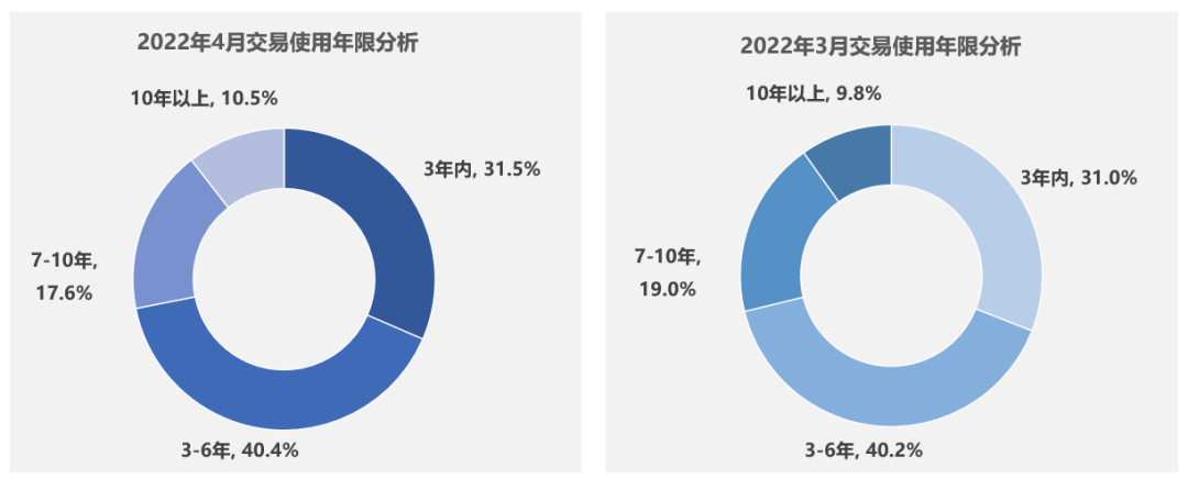 使用年限在 4-6 年的交易量占 28.9%,环比上月增加了 3.6 个百分点,较去年同期减少了 3.3 个百分点。
