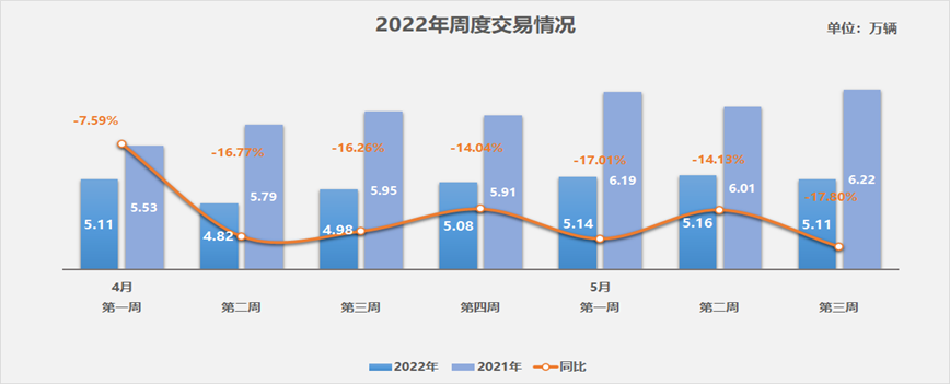 前三周情况来看虽然从总体交易规模上比 4 月份有所增加,但市场依然处于低位,目前的小幅增量主要来自于东三省地区的经营企业逐步恢复正常经营。但因北京的疫情影响整个华北地区在 5 月份都有非常明显的降幅,河北、天津也都受到不小的影响。5 月前三周环比 4 月同期增长 4.36%,预计 5 月总体交易规模在 113-115 万辆左右,同比下降 21%,较上月相比降幅减少了 5 个百分点。