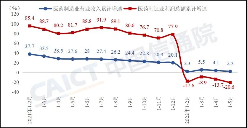 企业经营效益显著承压。受去年同期高基数及疫苗核酸检测价格持续下调影响,前5个月,我国医药制造业营业收入累计小幅增长2.3%,利润总额降幅达20.6%,较前4个月分别回落了1.8个和6.9个百分点。其中,5月份医药制造业营业收入增速和利润总额增速同比分别下降4.3%和38.6%,预计全年医药制造业企业效益将持续承压。