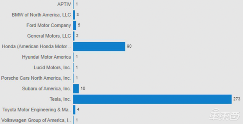 在报告中,共有12家公司报告了事故数据。其中,特斯拉报告了273起事故,占事故总数的70%左右。本田则报告了90起事故,斯巴鲁报告了10起事故。像宝马、福特、通用以及大众等车企的事故数据都在5起及以内。